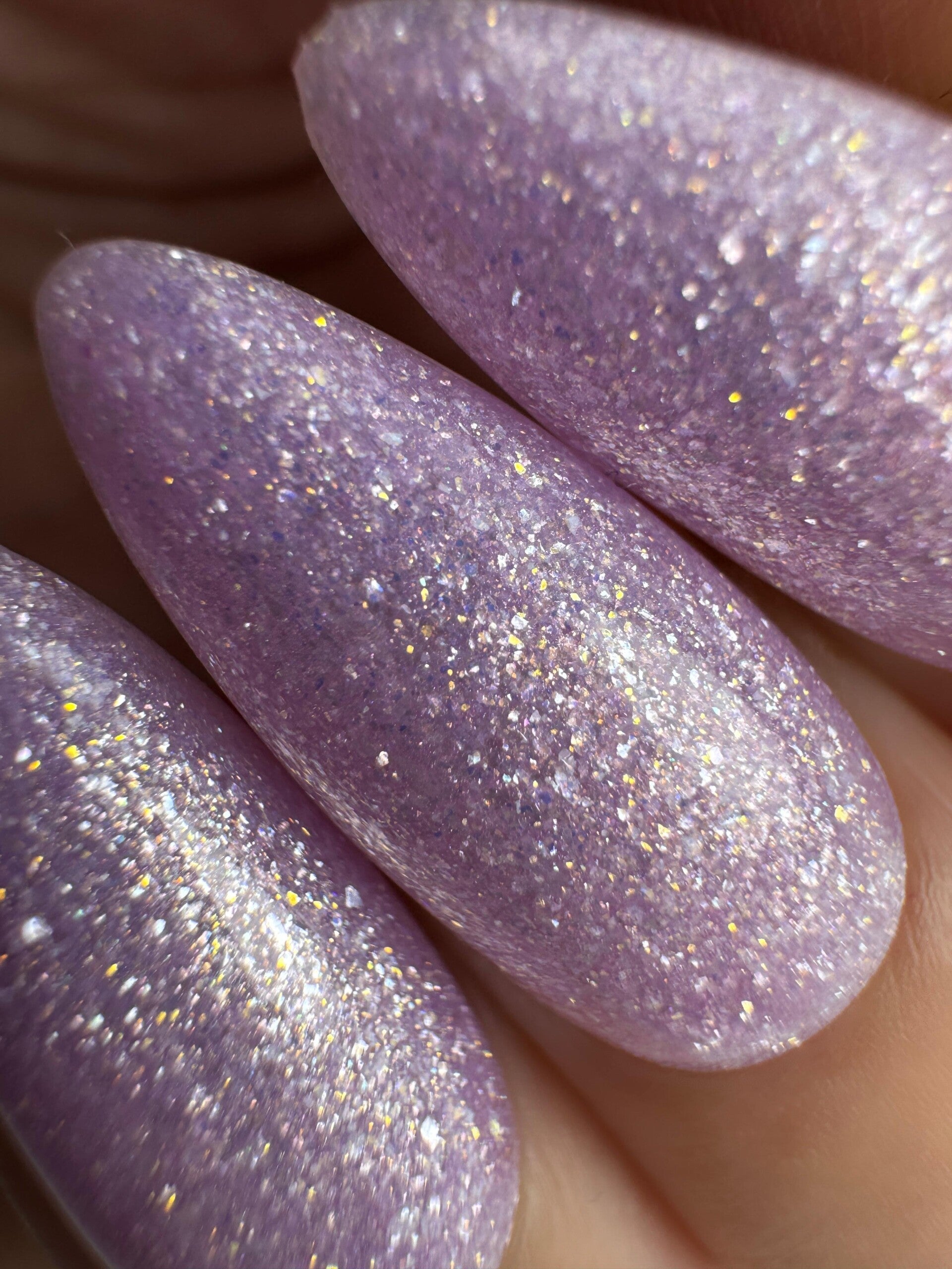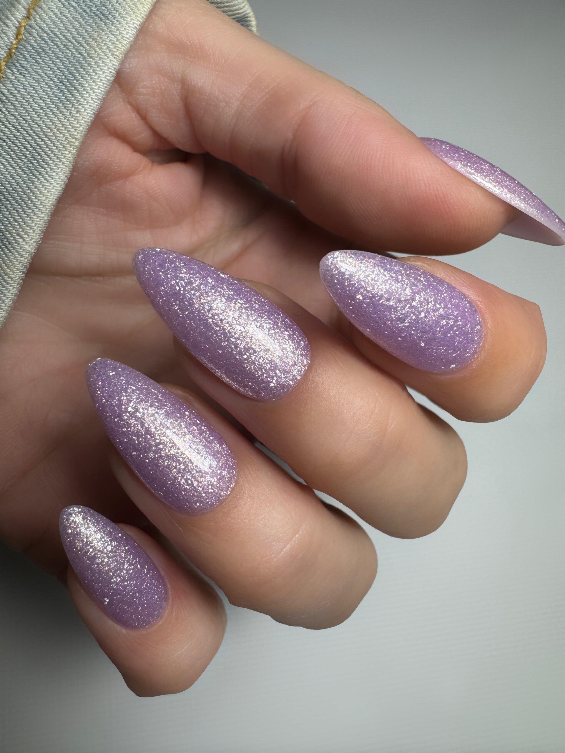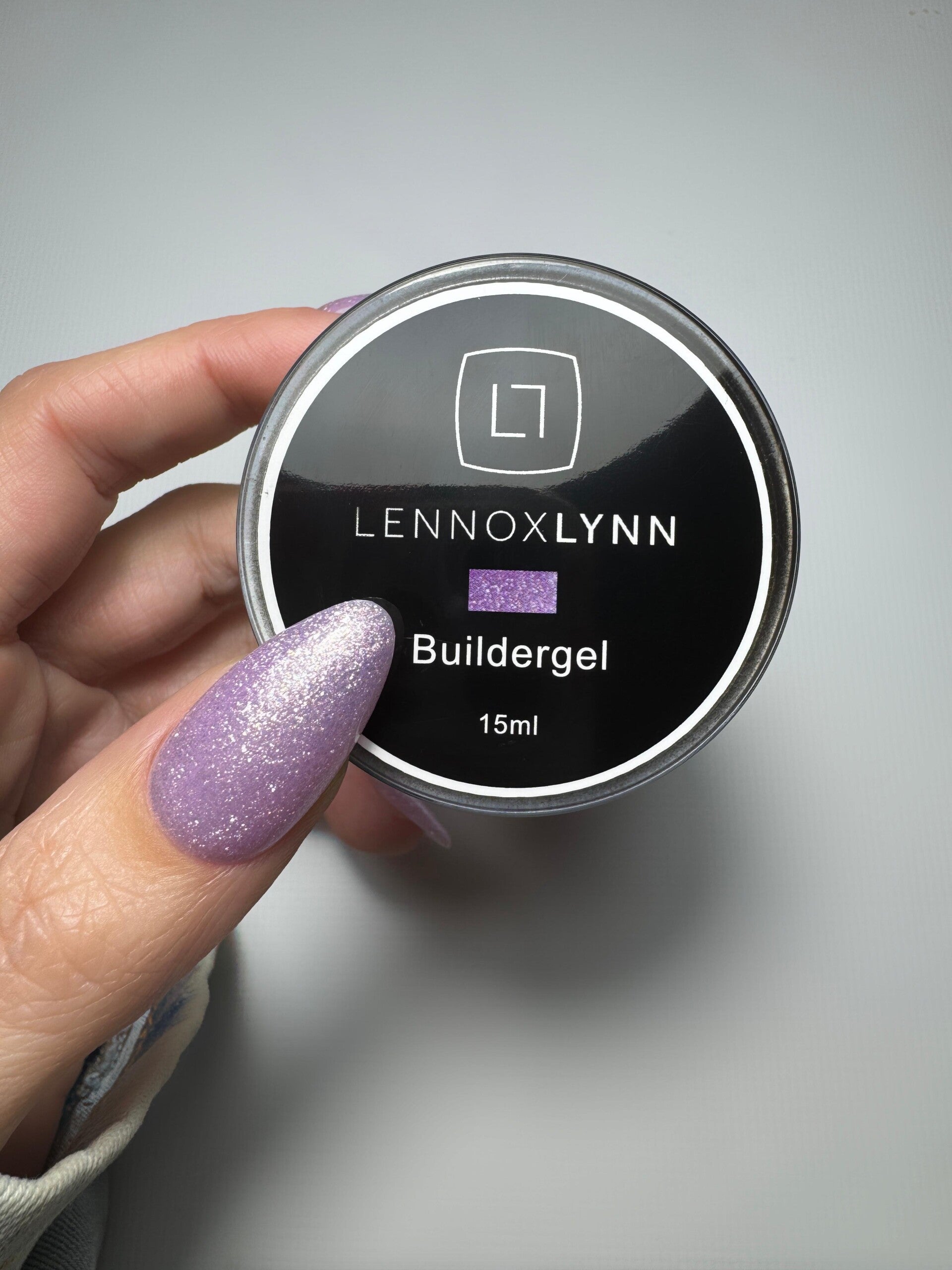Buildergel 3 is een zacht paarse kleur met zacht paarse glitter flakes en gouden glitter erin.