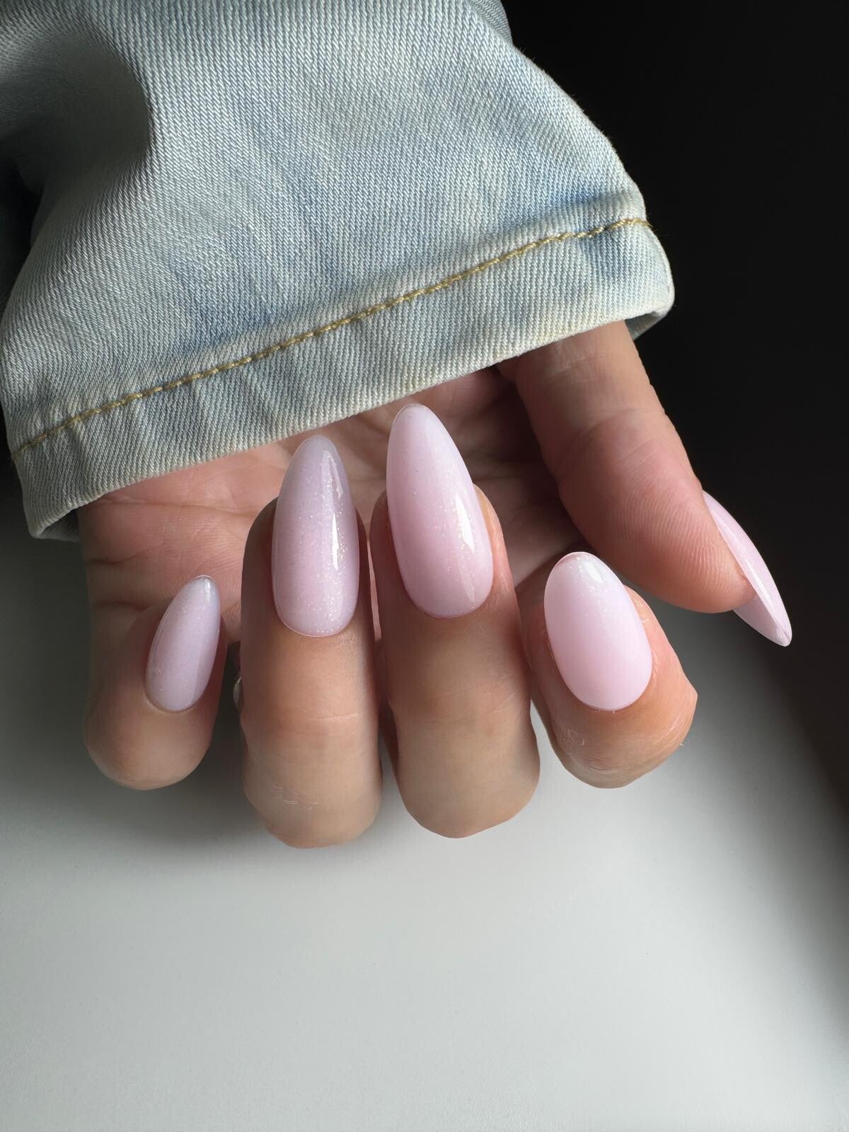 Buildergel In A Bottle 33 is een babyroze kleur met glitter.