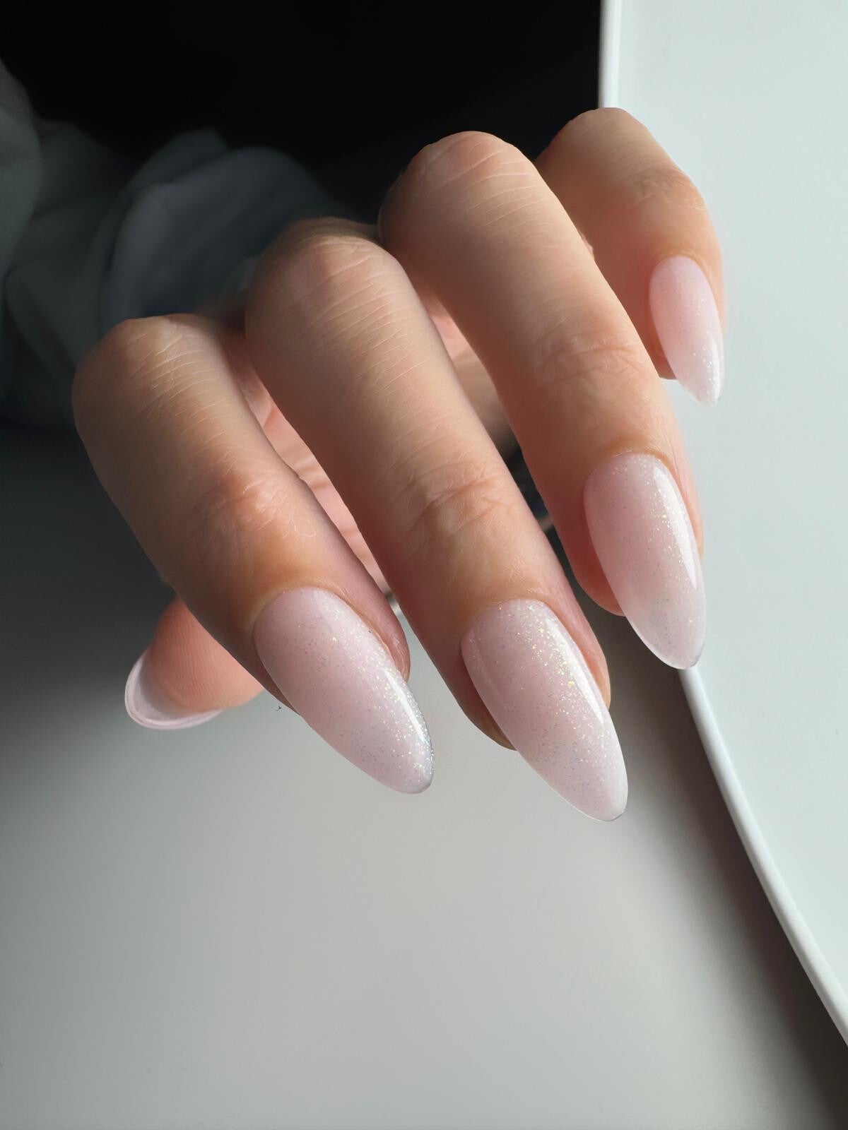 Buildergel In A Bottle 35 is een zachtroze kleur met glitter.
