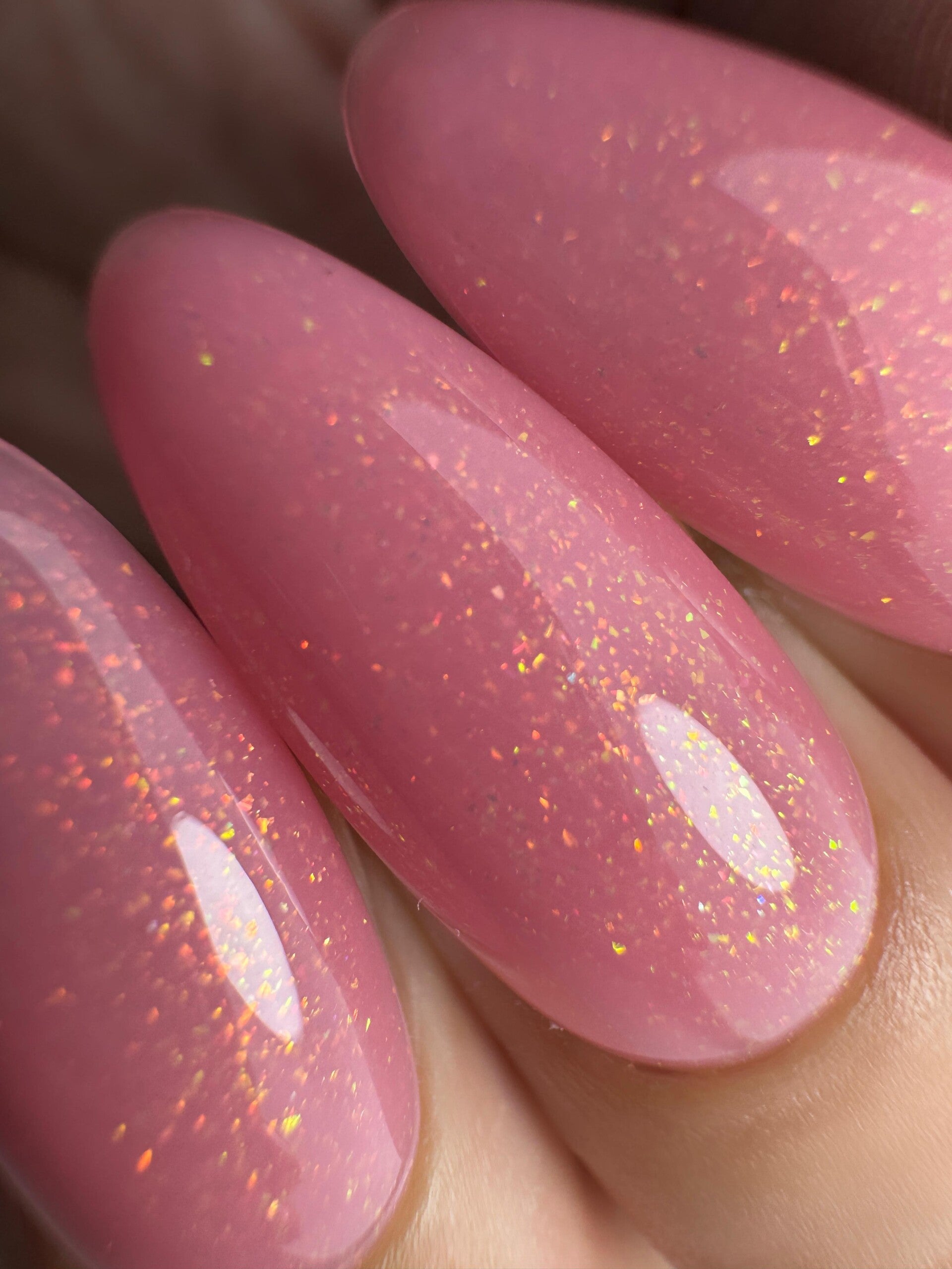 Buildergel In A Bottle 39 is een roze kleur met gouden glitter.