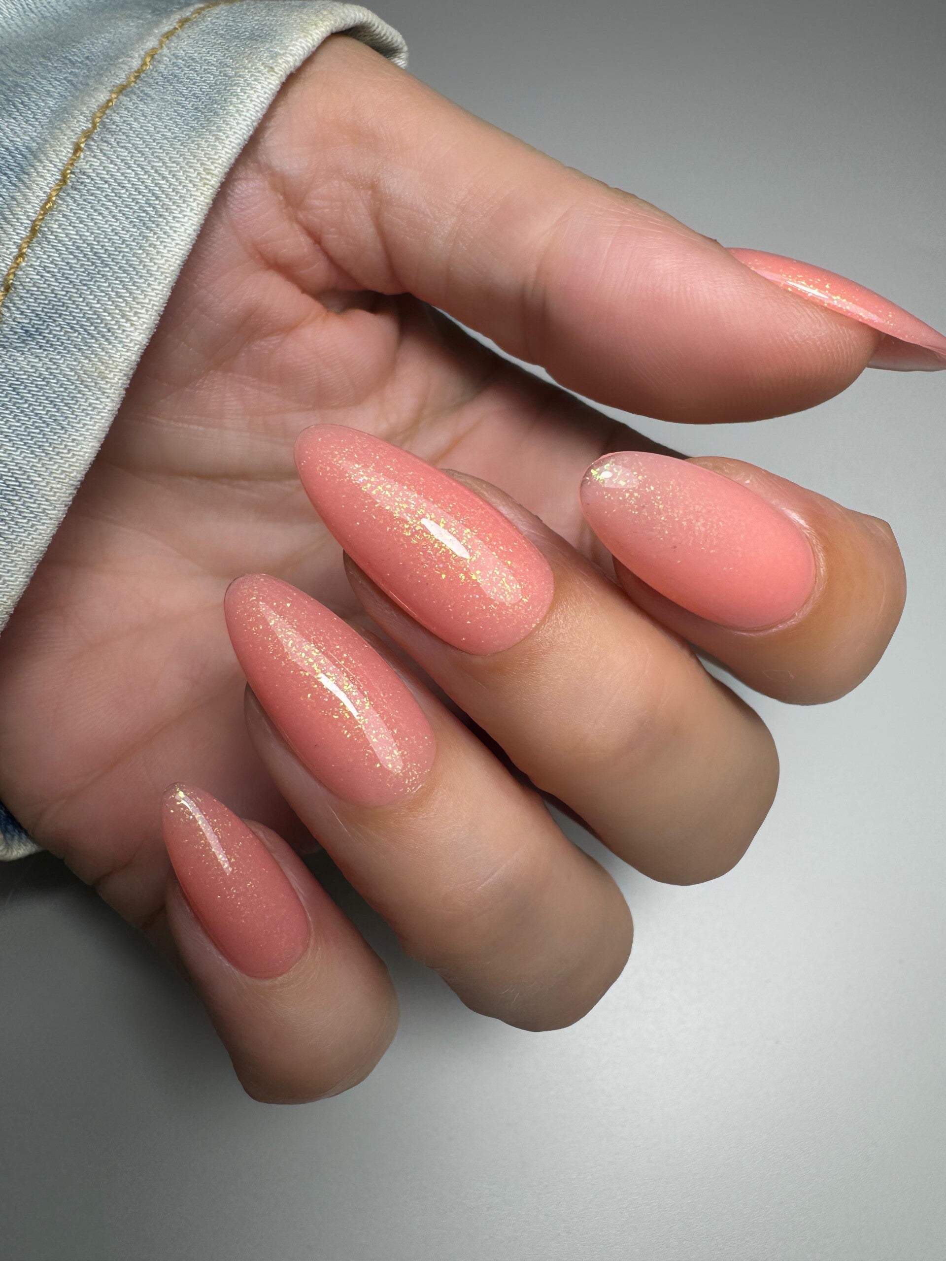 Buildergel In A Bottle 40 is een peach kleur met gouden glitter.