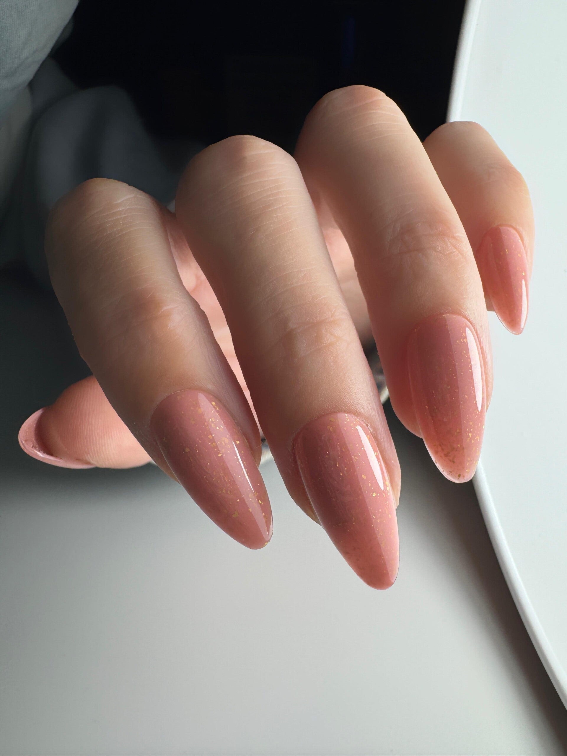 Buildergel In A Bottle 45 is een oud roze kleur met gouden flakes.