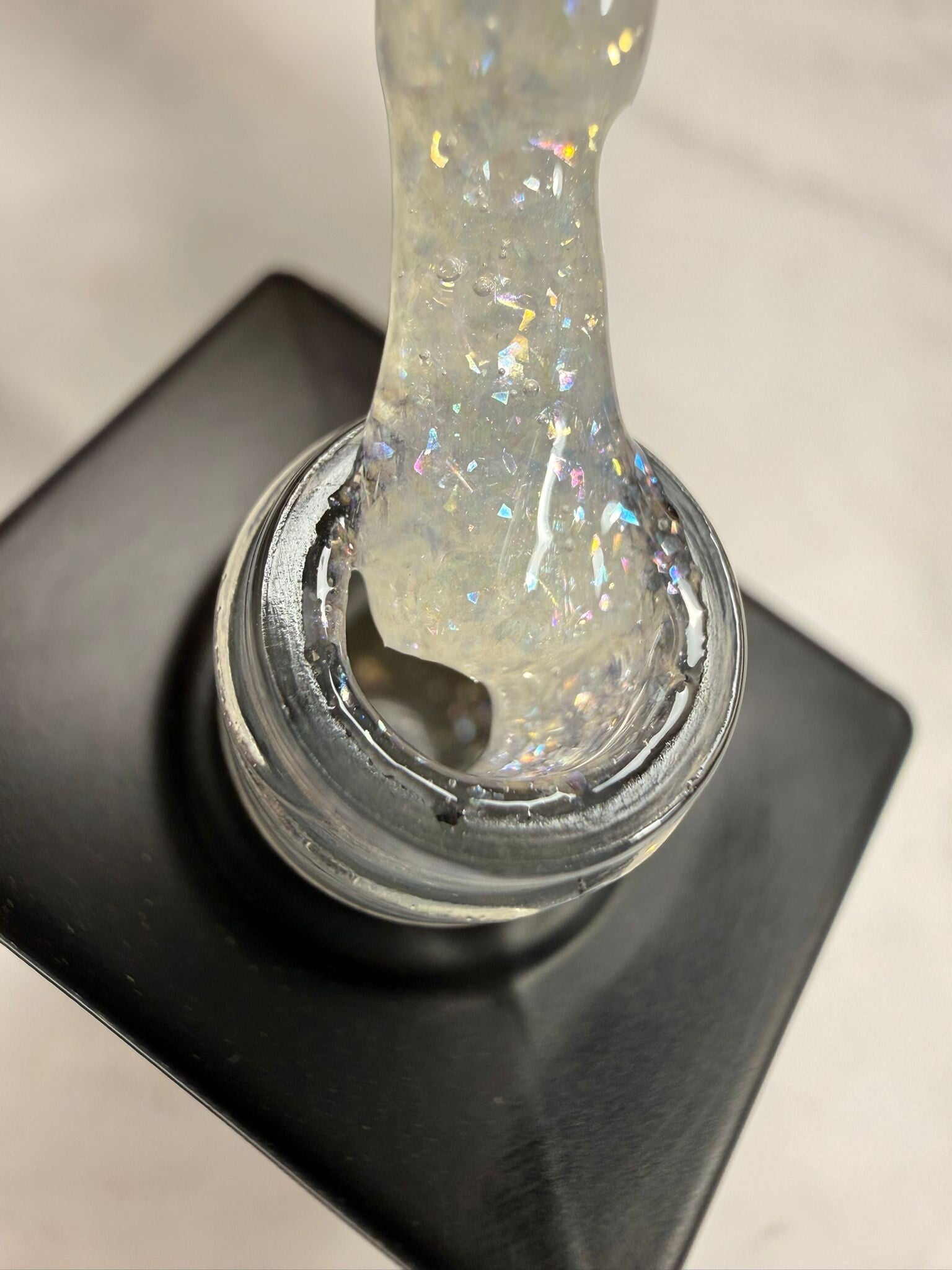 Deze topcoat heeft hele zachte doorzichtige glitter flakes.