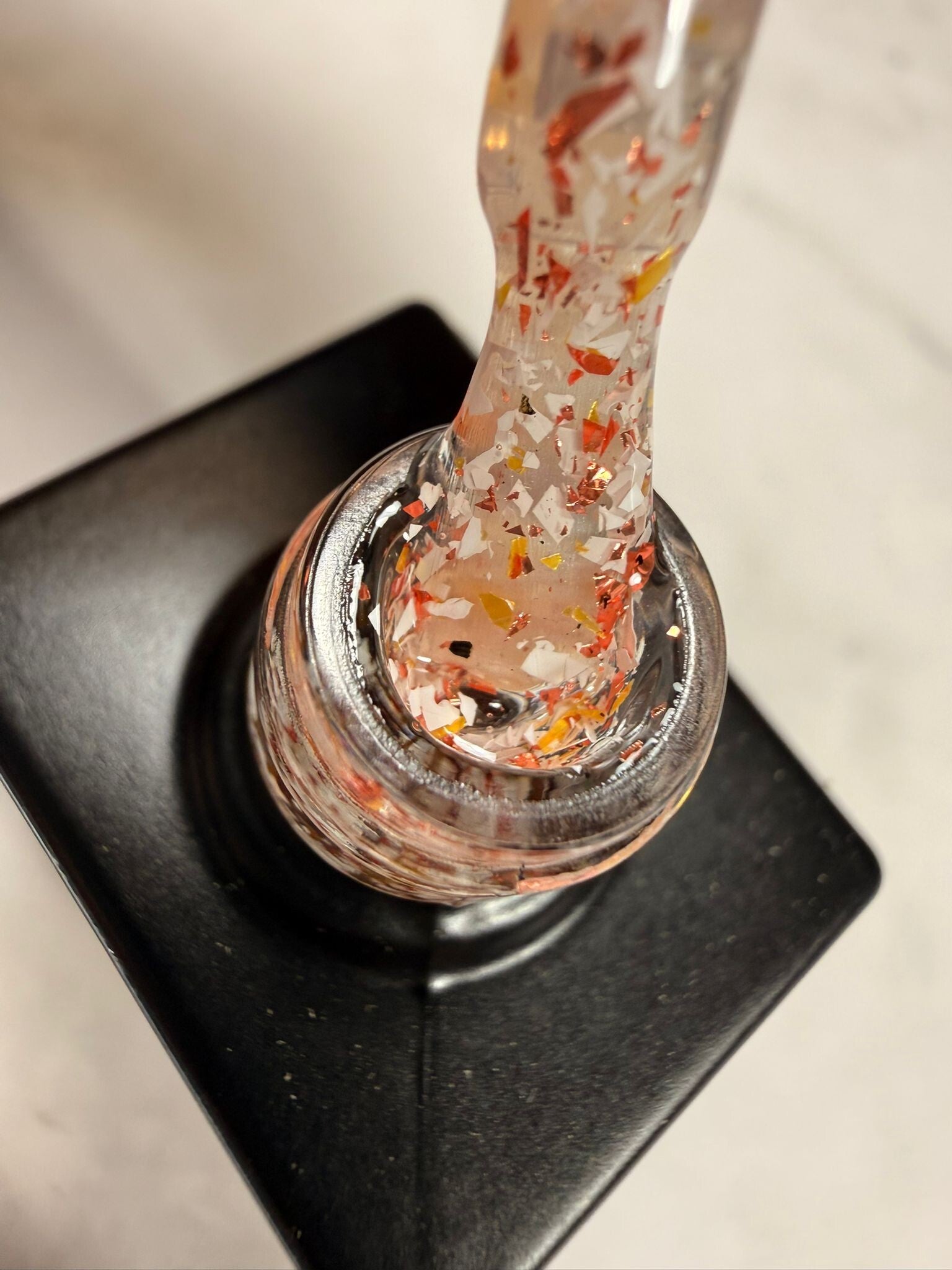 Deze topcoat heeft grote en kleine, witte, rode en gouden flakes.
